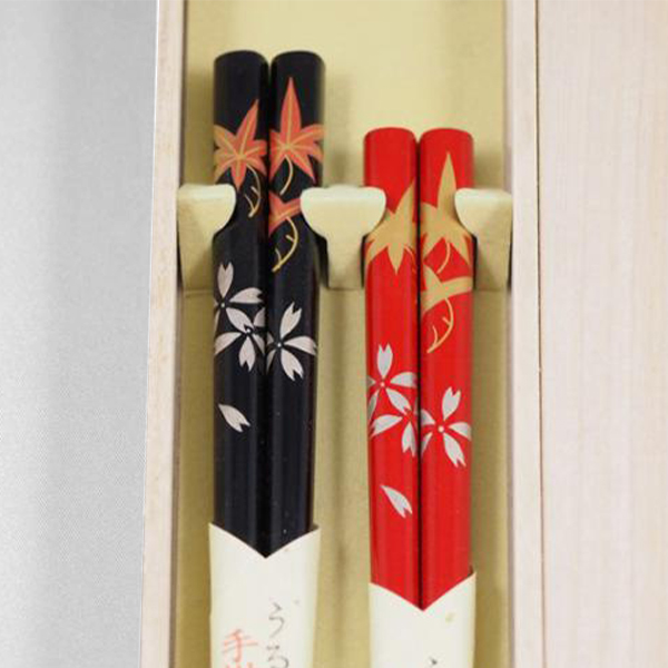 箸 夫婦箸 春秋蒔絵 ¥22,000(税込) ご購入はこちら 桐箱入りの夫婦箸。 箸の先端部分はすべり止め加工となっており、 持手部分には春の桜、秋の紅葉が蒔絵にて施されております。 春から夏、秋から冬にかけて一年中お使い頂ける模様です。 普段使いももちろん、御祝、贈り物としてもいかがでしょうか。 次の商品へ »乾漆箸